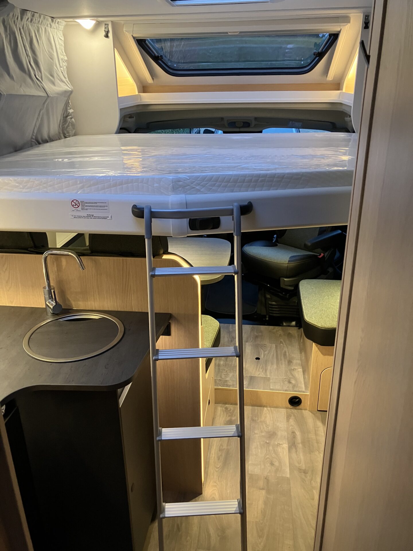 Binnen in de camper geniet je van een huiselijke sfeer en optimaal comfort. De slaapruimte is flexibel ingericht met comfortabele lengtebedden, die eenvoudig kunnen worden omgebouwd tot een ruim tweepersoonsbed, én een extra tweepersoons hefbed. Bovendien beschik je over een eigen toilet en douche, zodat je onafhankelijk bent van openbare voorzieningen. De keuken is volledig uitgerust, zodat je met gemak heerlijke maaltijden kunt bereiden, en de ruime koelkast met vriesvak houdt alles vers voor onderweg.